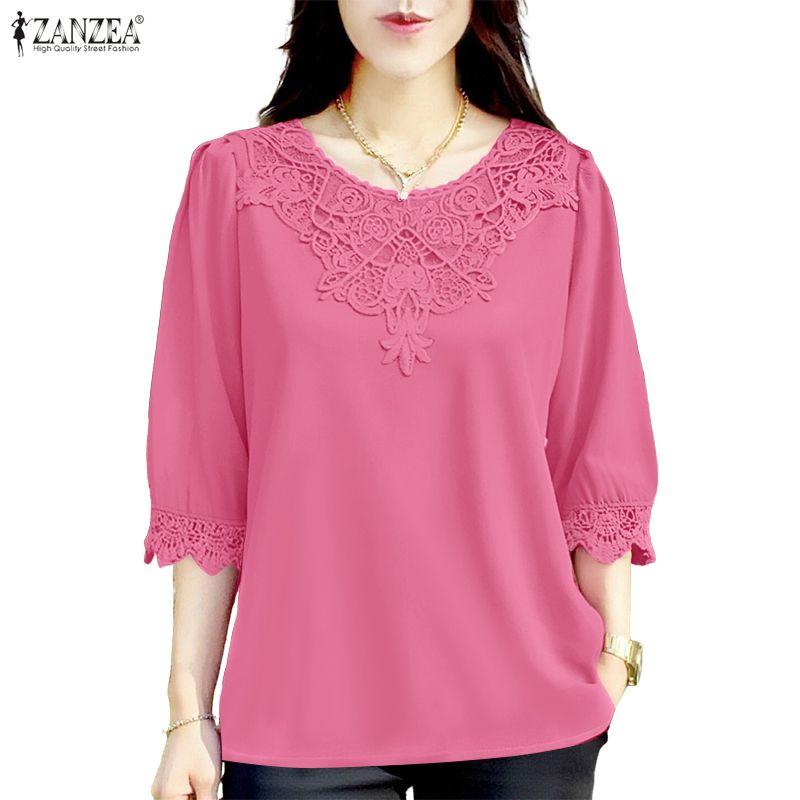 ZANZEA Women Crochet Patchwork Round Neck Casual Half Sleeve Blouse