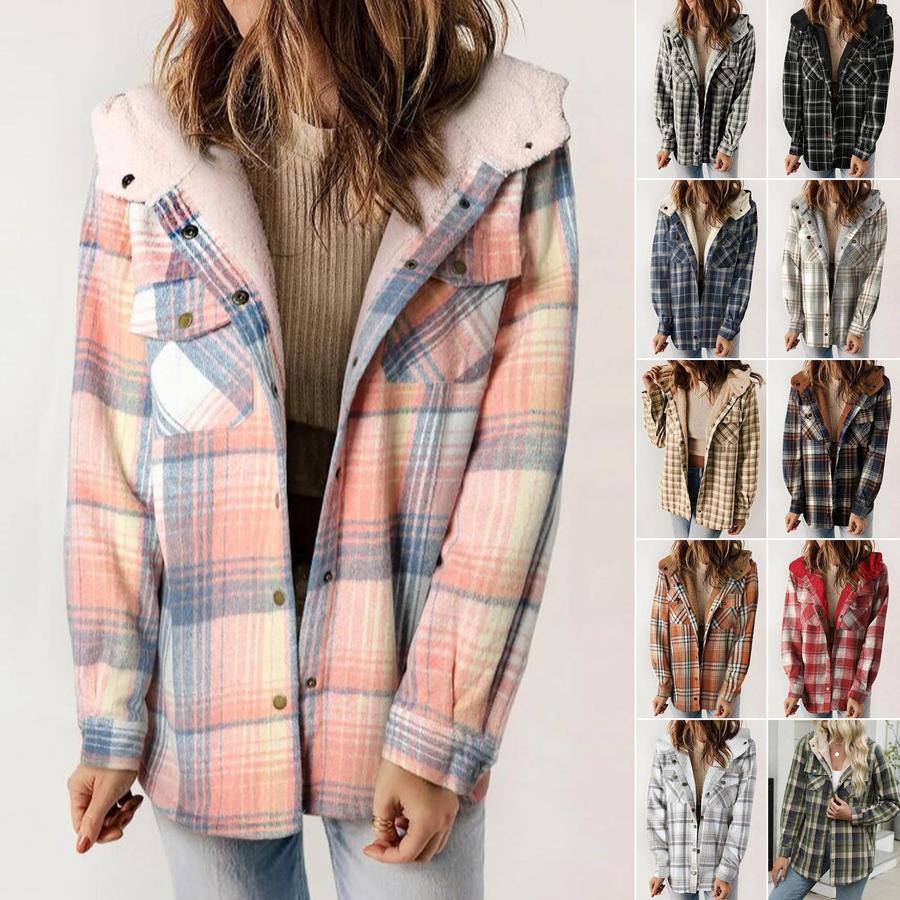 Fall Winter Women's Plaid Jacket Long Sleeve Hooded Cozy Coat with Pockets
