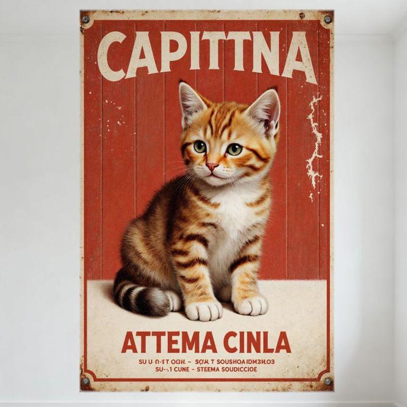 Vintage Red Wooden Plank Cat Kitten Metal Tin Sign, 'CAPITTNA' Distressed Serif Letters with Orange Tabby Cat Wall Decor for Bar