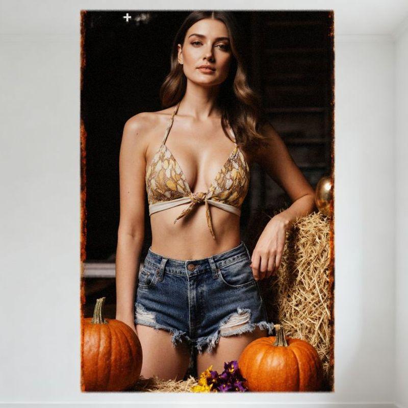 Sexy Woman Long Wavy Brown Hair Rustic Autumn Hay Bale Pumpkins Flowers Vintage Metal Tin Sign for Bar Pub Home Wall Decor