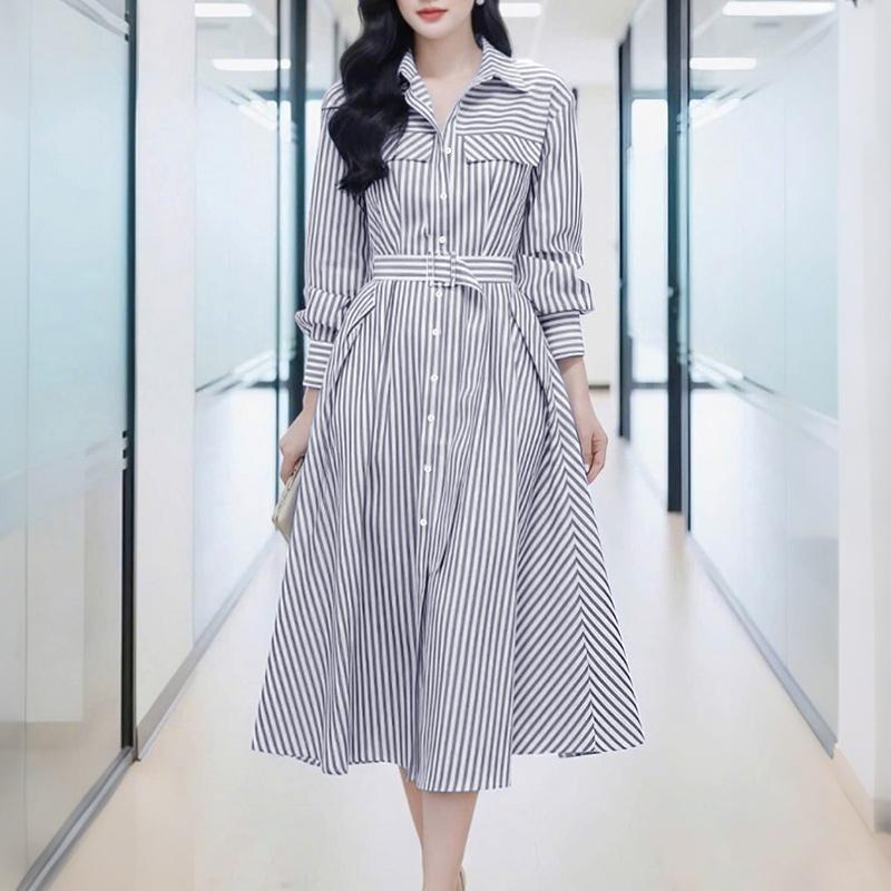ZANZEA Women Casual Turn Down Collar Long Sleeve Loose Stripe Dress
