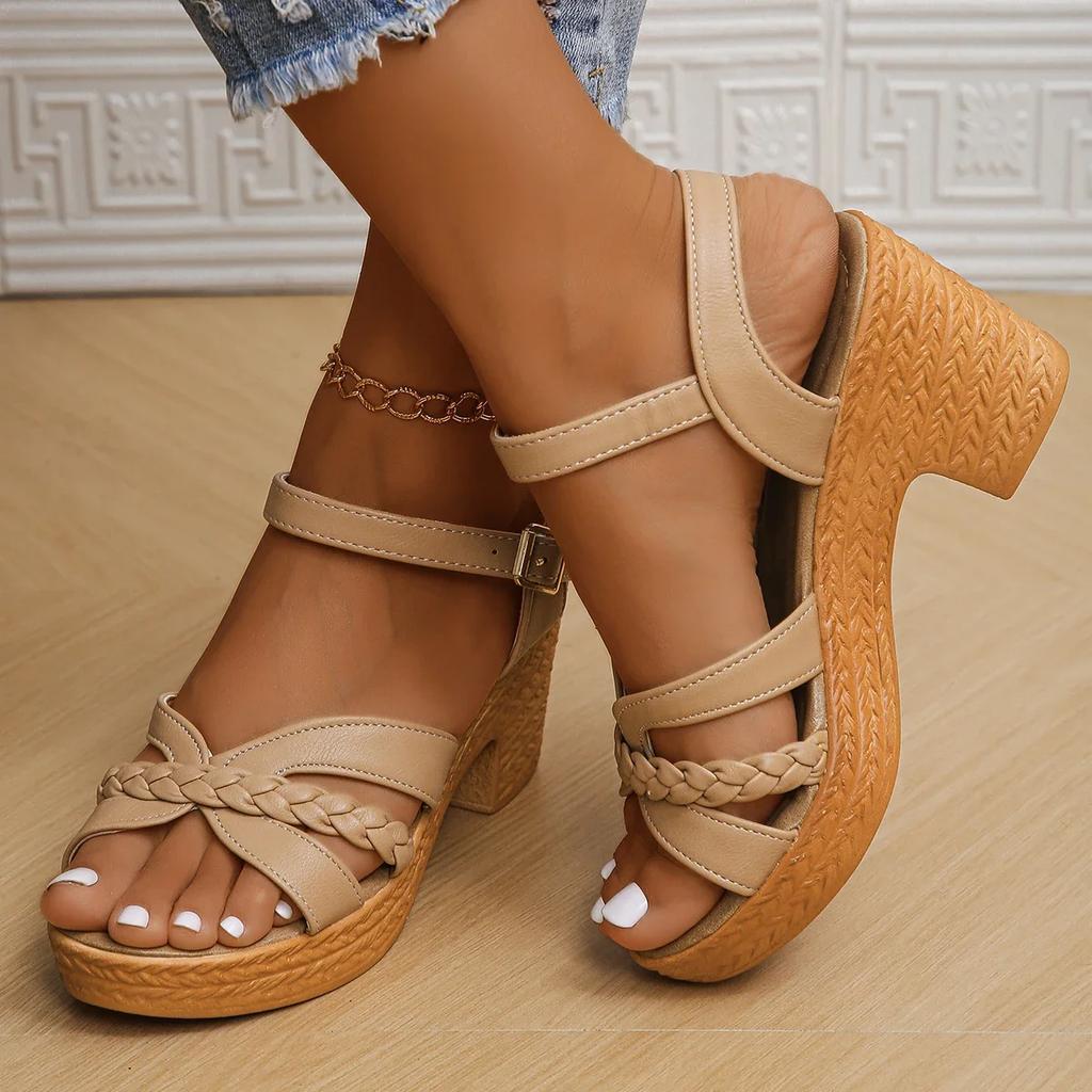 Fashion Camel Thick High Heels Sandals Women Summer 2025 Buckle Strap Platform Sandles Woman Woven Cross Band Gladiator Sandalias Mujer