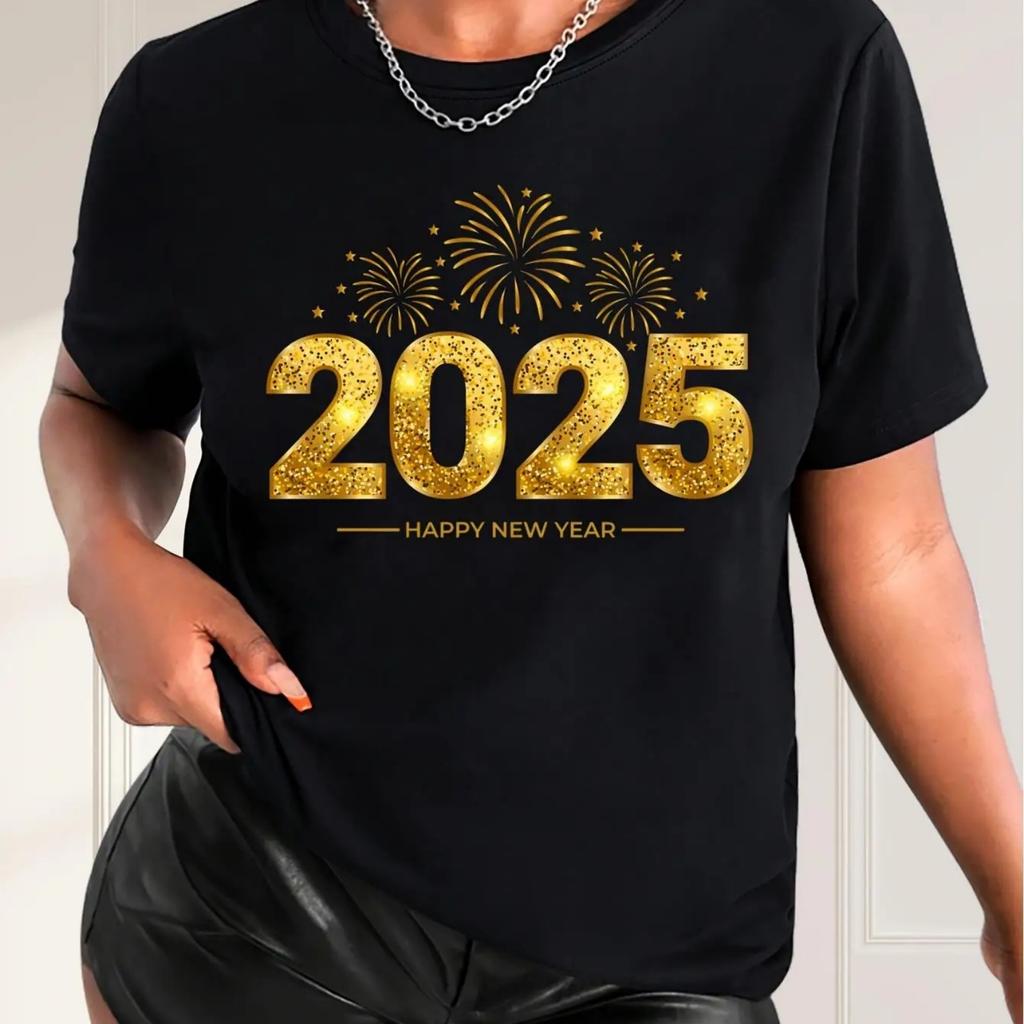 1pc Women'S Casual Glitter Fireworks Print T-Shirt, Round Neck Short Sleeve Top, Knit Fabric, Fashion Tee