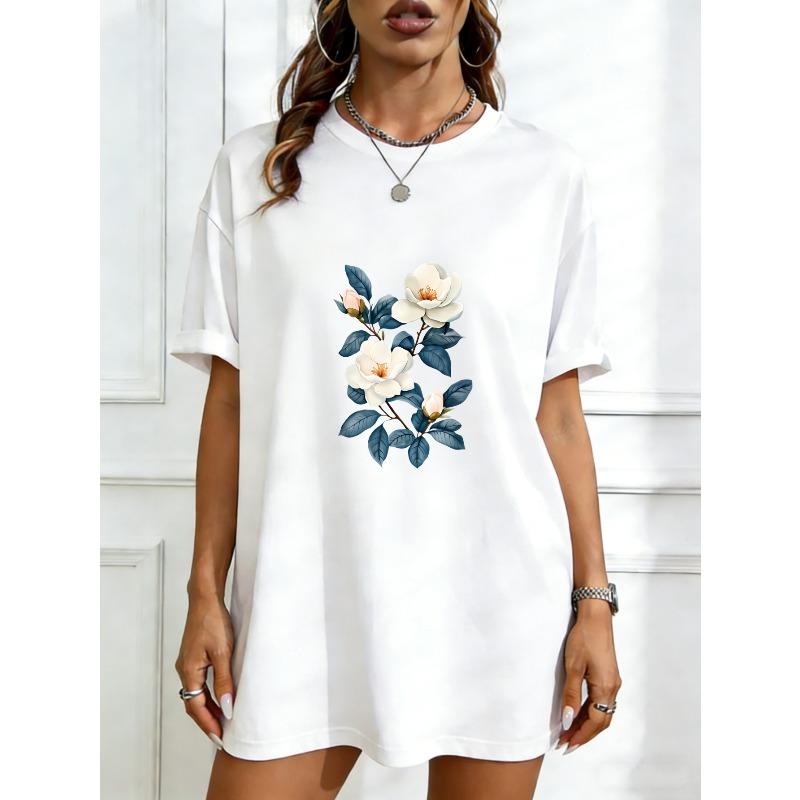Oversized T Shirt Dress Black Magnolia Flower Print Casual Wear