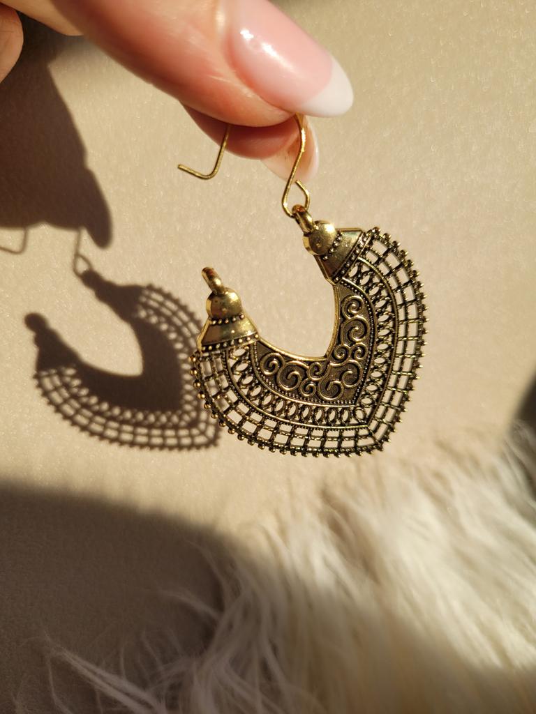 PENDIENTES Pendientes de estilo gitano tallados cuidadosamente. Llegaron a Italia con envío rastreado en 22 días. Envío súper rápido. Bien envueltos en una hoja de plástico de burbujas llegaron intactos. envoltorio: Se entregan en una bolsita de plástico sin el soporte de cartón. Relación calidad-precio excelente. El color del metal es plata bruñida en aleación de zinc. Cierre trasero: gancho de metal. No se encontraron defectos.. Se recomienda la compra👌👌👌👌👌