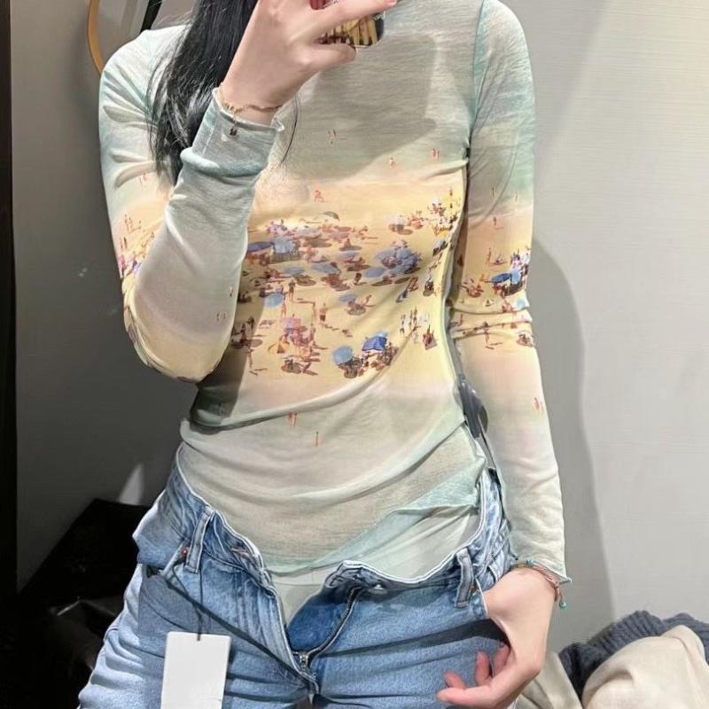 Moda Femenina Calle Retro Tie Dye Estampado de Seda Manga Larga Tops Ajustados Camisa Corta Básica
