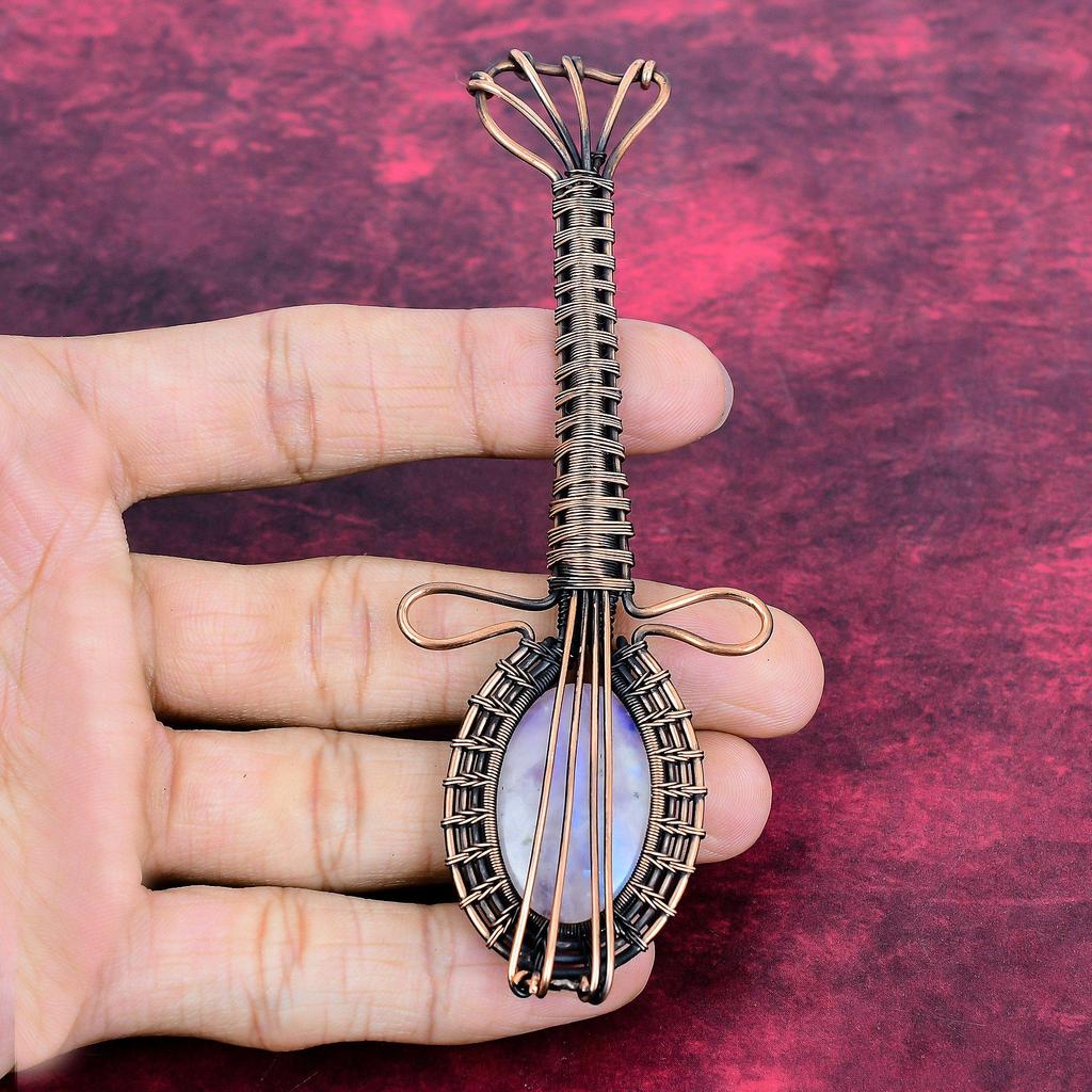 Rainbow Moonstone Pendant Copper Wire Wrapped Gemstone Jewelry Guitar Pendant