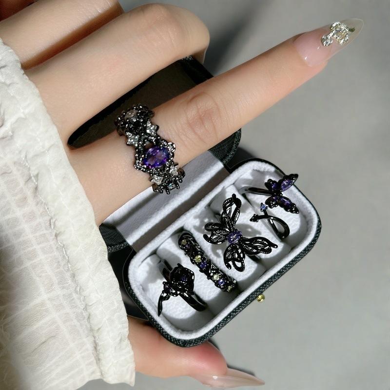 Punk Dark Style Personality Purple Diamond Inlaid Zircon Butterfly Open Ring Stacked With Niche Design High-End Ring Woman