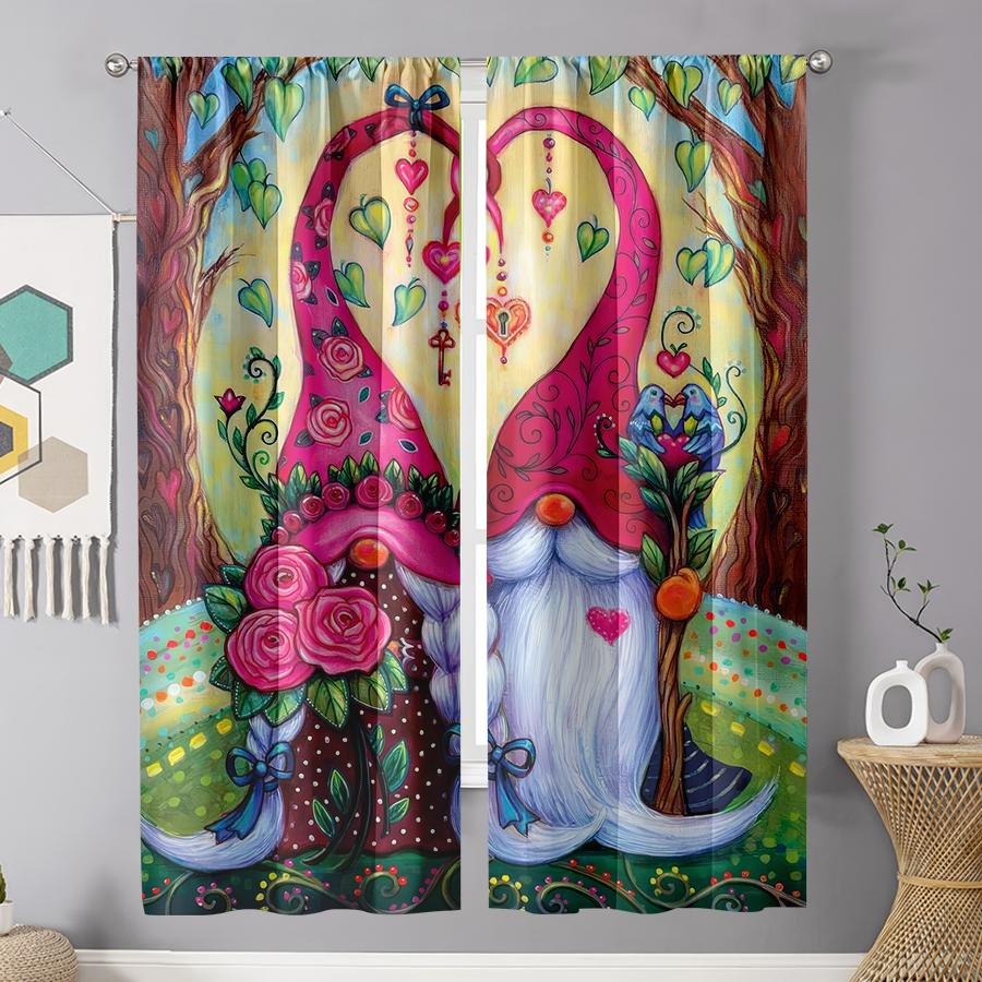 2pcs Vibrant Love Gnome & Rose Curtains, Ideal for Valentine's Day Window Decor, Whimsical Home Bedroom Living Room Decor