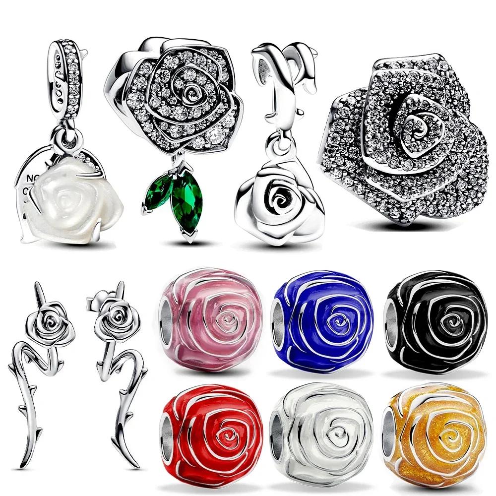 925 Silver Rose Bloom Necklace Earrings Set Women Gift Jewelry Original Charm Beaded Collection