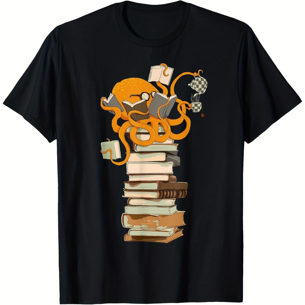 Reading Octopus Graphic Tee Men Casual Crew Neck Soft Cotton Short Sleeve T-Shirt for Book Lovers