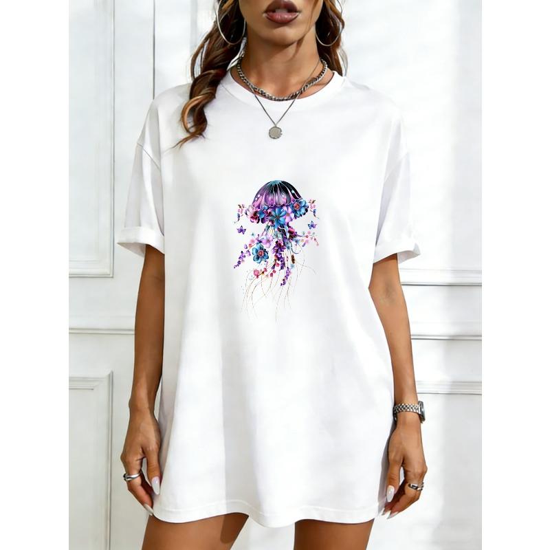 Oversized T Shirt Black Jellyfish Floral Print For Casual Wear