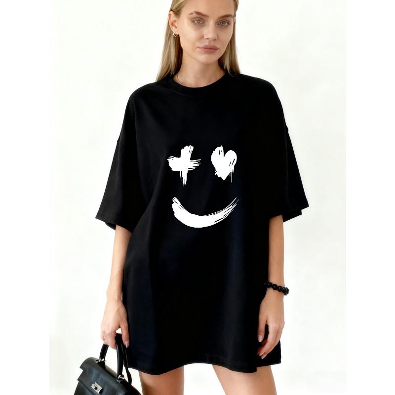 Vestido Camiseta Oversize Negro Cara Sonriente Con Estampado de Cruz y Corazón Estilo Streetwear Casual Para Mujer