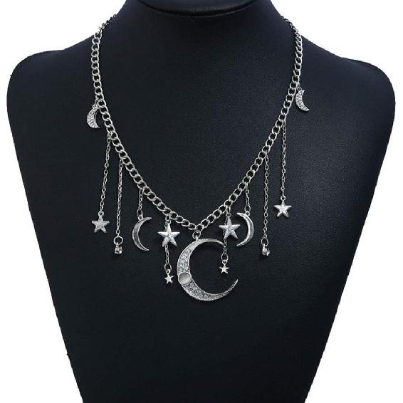 JczR.Y Moon and Star Necklace - Crystal Star Moon Tassel Rhinestone Crescent Pentagram Fringe Pendant for Women Party Statement Jewelry Accessories
