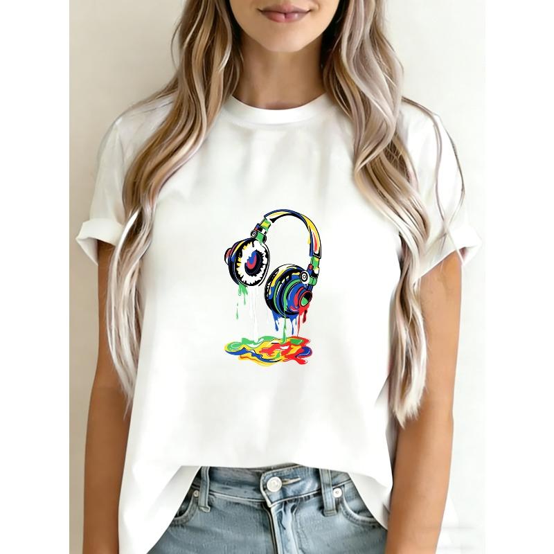 White T Shirt With Colorful Headphones Drip Design For Music Lovers Casual Wear