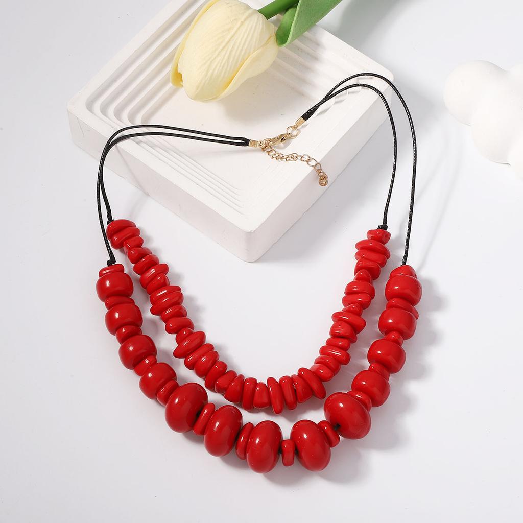 New red resin coral double layer stacked irregular geometric round necklace, retro fashion