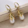 Women Vintage Golden Plated Flower Imitation Pearl Lily Pendant Earrings Inlaid Synthetic Zirconia Dangle Earrings Jewelry Craft