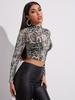 Women's V-Neck Velvet Rose Print Bell Sleeve Top