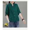 Top de manga tres cuartos holgado con estampado de cuadros retro para mujer, modelo 2025, fino, moderno, con cuello en V, manga media y cierre de botones.