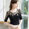 Women's Black Lace Panel Top Half Sleeve Rose Embroidery Rhinestone Casual Slim Fit Blouse