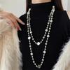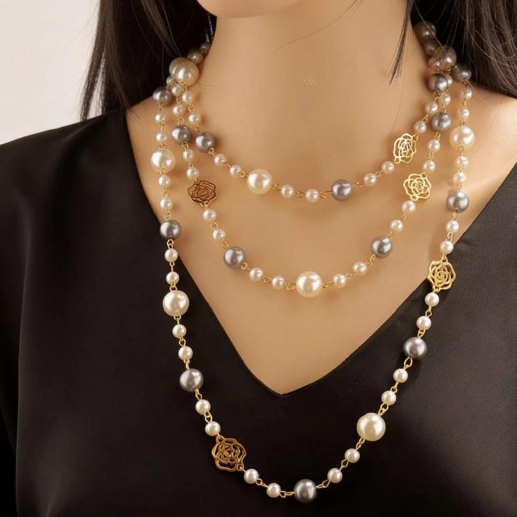 Korean Fashion Pearl Necklace: Elegant Rose Pendant, Versatile Multi-Layer Design, Long Style.