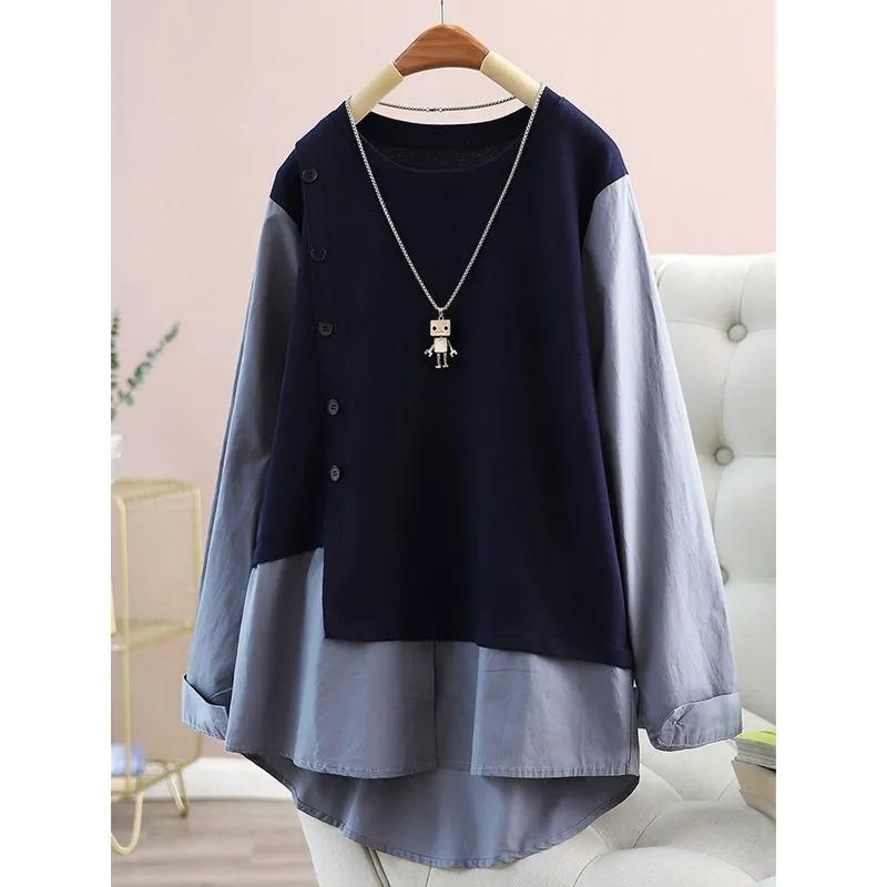 Women's Patchwork Knit Blouse Fake Two-Piece Long Sleeve Top