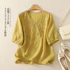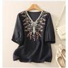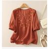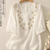 Blusa de Lino Blanca para Mujer Manga Corta Cuello en V Bordada Floral Top Casual