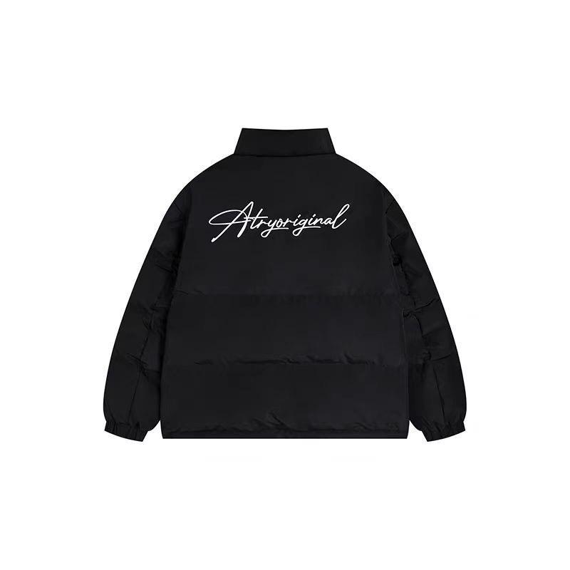 Unisex American Print Cotton Puffer Jacket, Black Stand Collar, Winter-Ready, Thick, Casual Coat