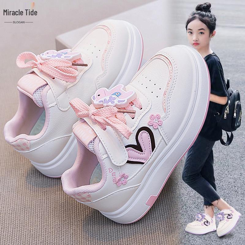 Girls' 2026 Spring Leather Casual White Cartoon Sneakers with Soft Soles