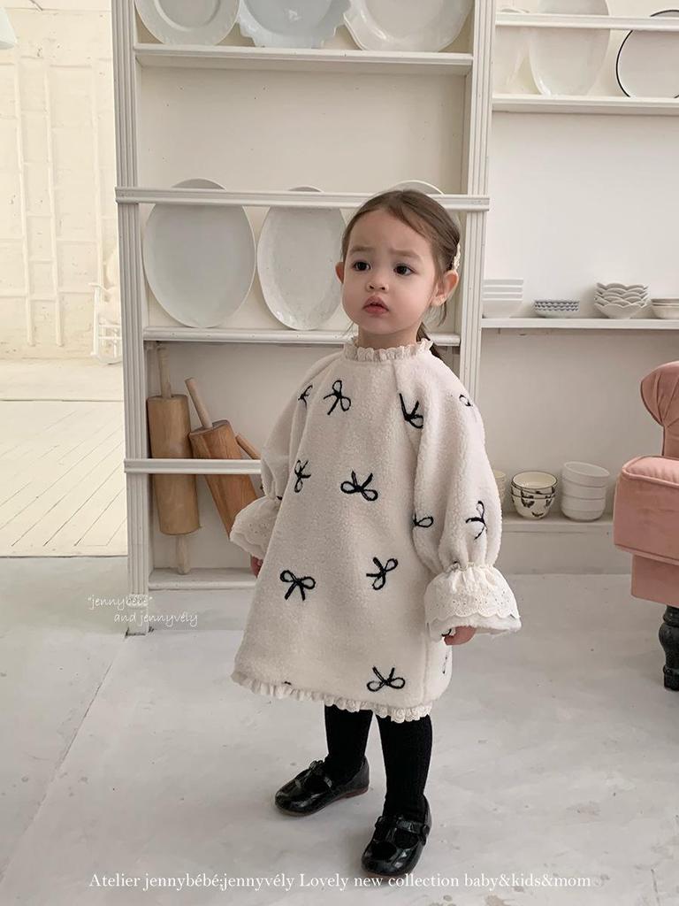 JennyBebe Korean-Style Lamb Wool Winter Dress for Baby Girls with Bow