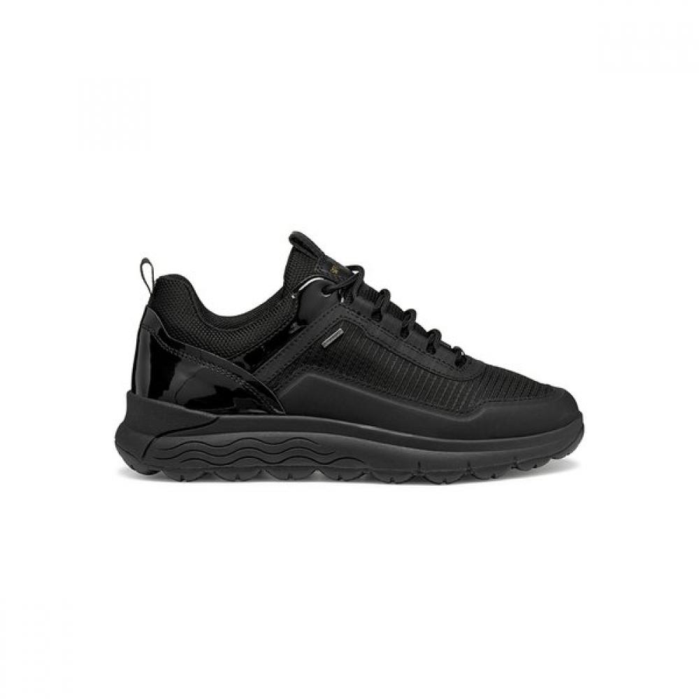 The GEOX women's waterproof comfort sneaker is available in black and features innovative breathability technology that allows sweat to escape while blocking external moisture. The ZeroShock comfort system provides shock absorption and a comfortable fit, while the 4X4 design offers stable grip and traction performance across various terrains. The product's lightweight and flexible sole structure make it comfortable for long periods of wear.
