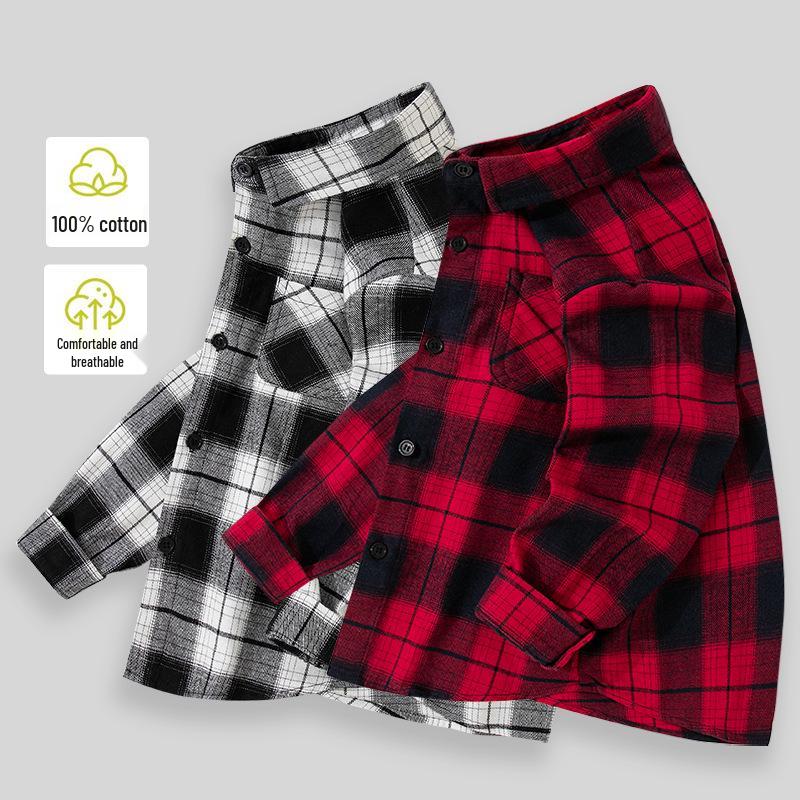 Boys' Spring & Autumn Plaid Long-Sleeve Shirt - Korean Style, Comfortable, Pure Cotton for Older Kids