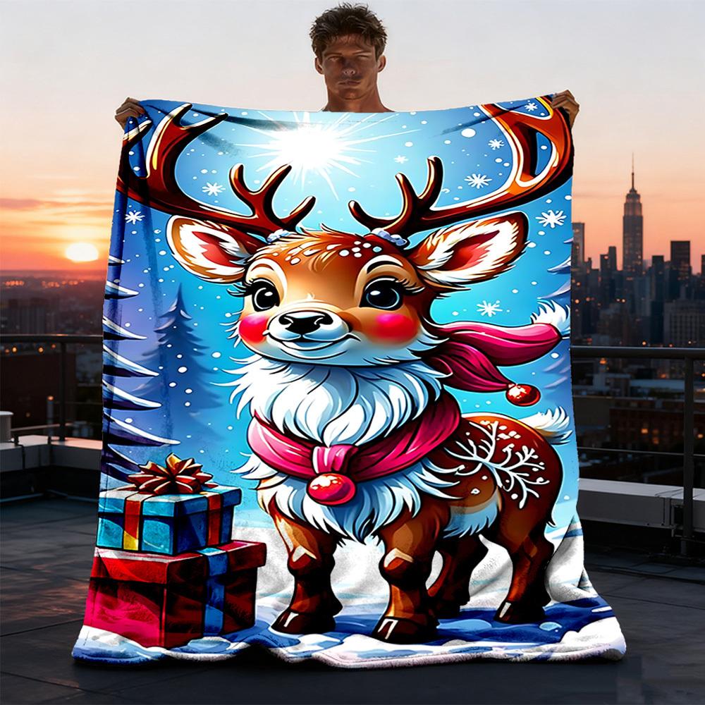 1pc Reindeer Gifts Throw Blanket Polyester Fiber, Lightweight Flannel, Soft & Warm, All Season Use for Outdoor, Camping Digital Print