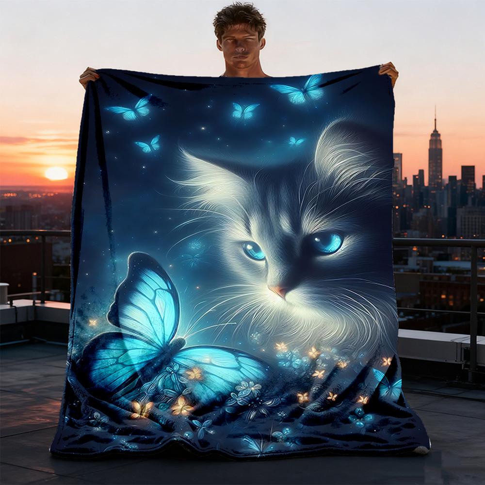 1pc Butterfly Cat Night Throw Blanket Polyester Fiber, Lightweight Flannel, Soft & Warm, All Season Use for Outdoor, Camping Digital Print