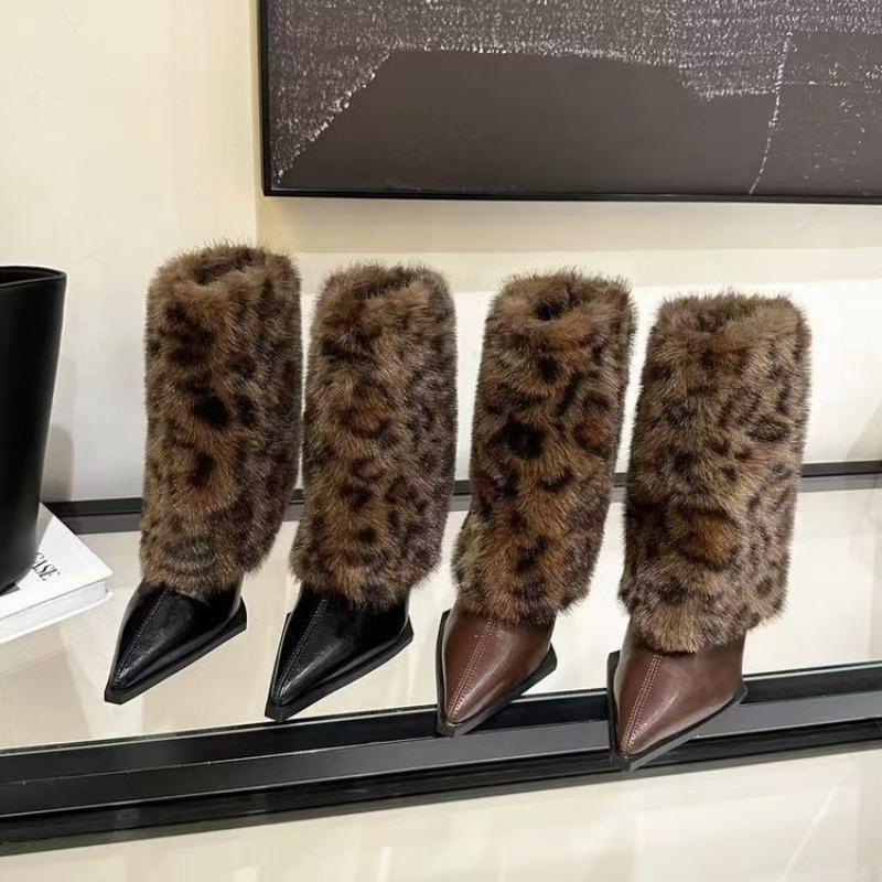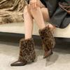 Sharp Pointed Thin Heel Leopard Print Hairy Short Boots for Women Autumn Winter , Niche Pants Boots High-heeled Mid Heeled Boots