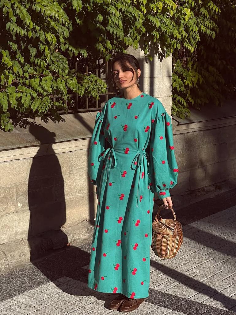 Women's spring European and American new fashion printed bubble sleeves slim lace-up retro dress