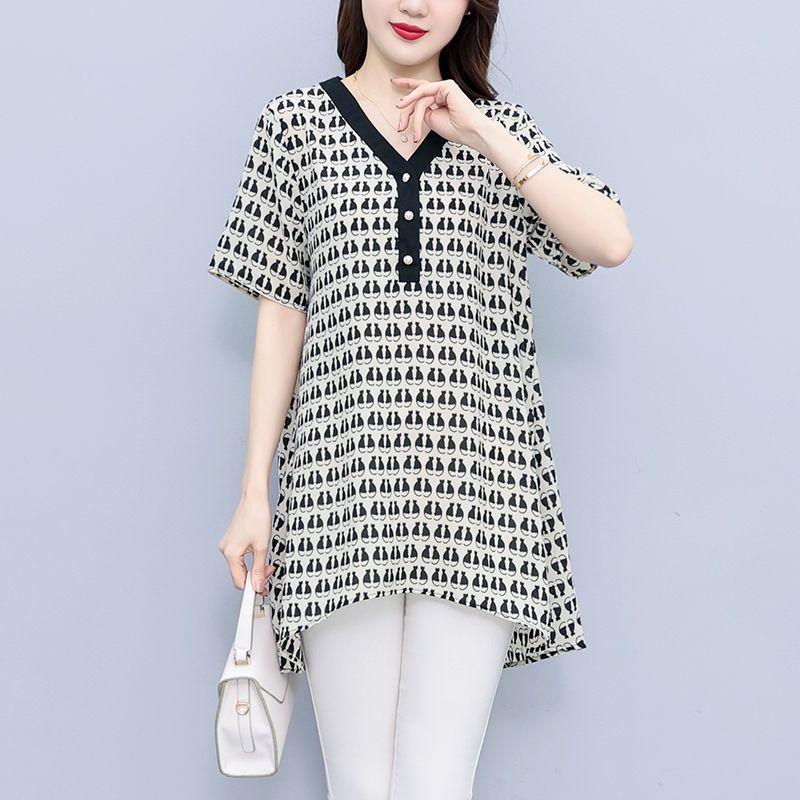 Korean Minimalist New Summer Printing Women's V-neck Button Fashion Versatile Short Sleeve Loose Mid Length Chiffon Shirt Tops
