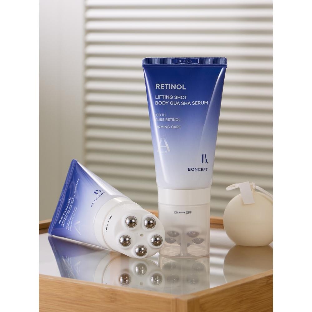 BONSEP Retinol Elastic Shot Body Gua Sha Serum 100ml is a body-specific product from the BONSEP retinol lineup, emphasizing skin elasticity improvement and gua sha massage effects. This serum contains German pure Vitamin A retinol and plant-based retinol, Bakuchiol, effective for skin elasticity, antioxidant care, and enhancing the moisture barrier.