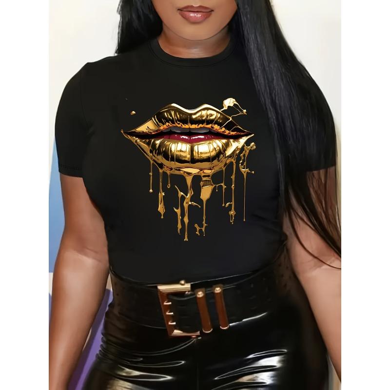 Women's Lip Print Crew Neck Short Sleeve Casual All Season Layering Tee Machine Washable