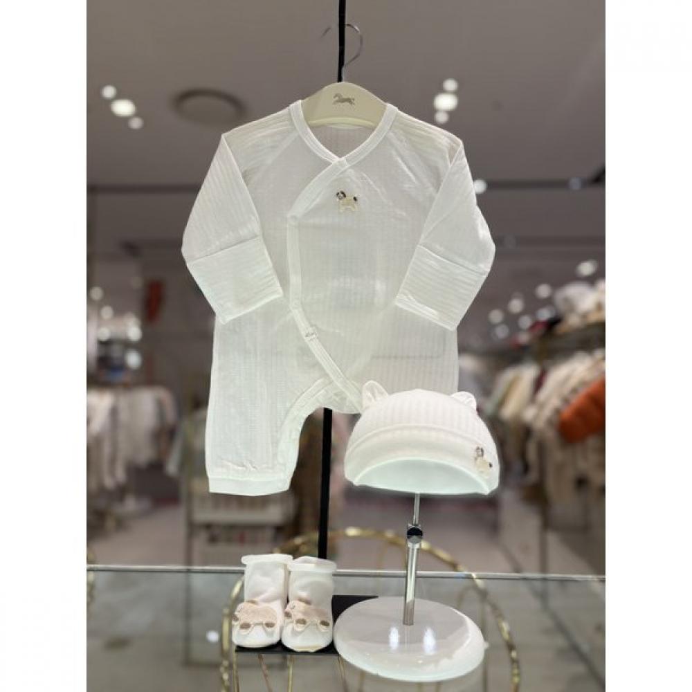 The Etwa baby onesie set includes comfortable clothing to protect the delicate skin of newborns. The bassinet suit is suitable for the sensitive skin of newborns, while the cute beanie keeps their head warm. The socks protect the feet and may include anti-slip features. This product is a perfect gift for births or pregnancies celebrated during the year of the horse, comprising a onesie, a beanie, and socks.