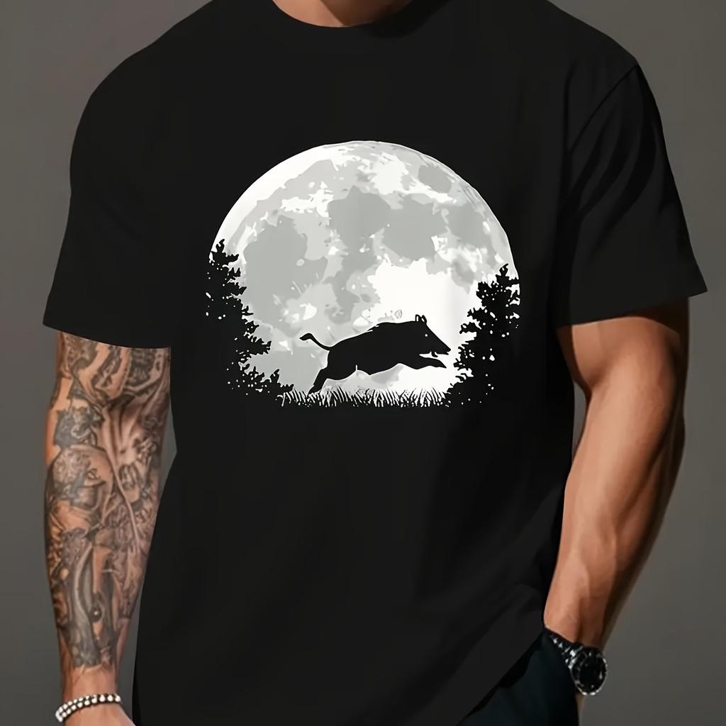 Wild Boar Moon Graphic Mens Cotton TShirt Breathable Short Sleeve Casual Hunting Tee