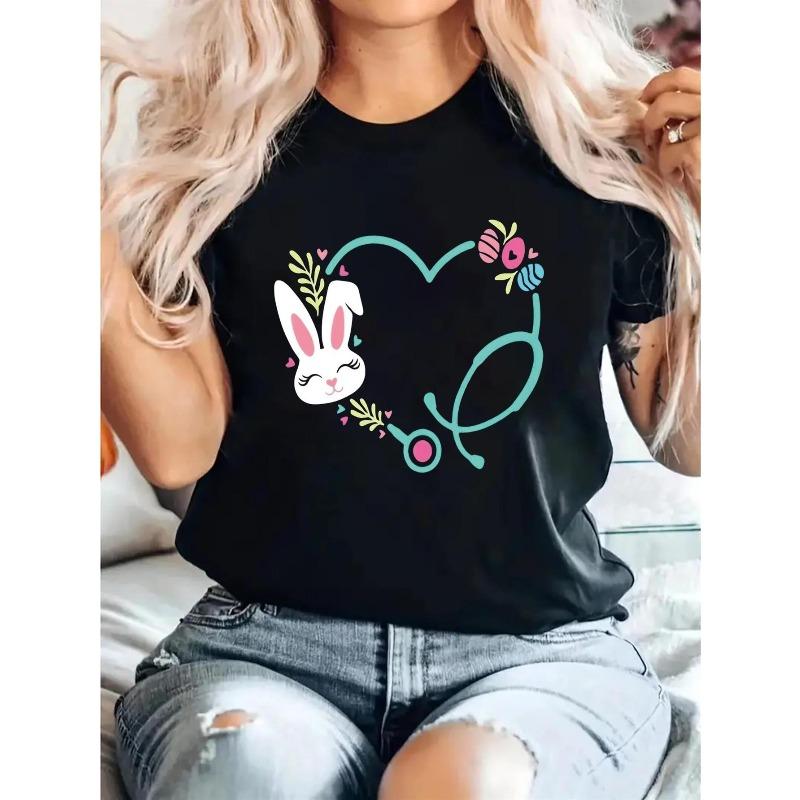 European Size Women's Nurse Bunny & Stethoscope T-Shirt - Easter -Themed Print Short Sleeve Top,Round Neck Casual Summer Blouse for Nursing Attire