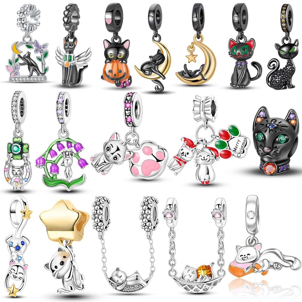 Original 925 Silver Black Cat Moon Cat Paw Pendant Charms Bead Fit Bracelet Women Jewelry Diy Anniversary Gift Accessories