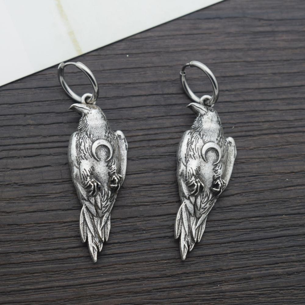 Norse Viking Wiccan Moon Phase Raven Earrings Stainless Steel Hook Handmade Jewelry