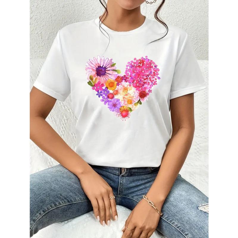 European Size Valentine's Day Women's Casual Round Neck Short Sleeve T-Shirt with Pink Floral Heart Print - Perfect Choice for Spring and Summer