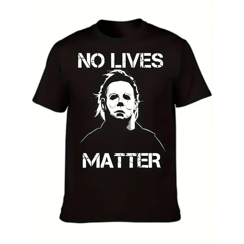 European sizes Michael Myers Halloween T-Shirt, Black with White "Life Doesn't Matter" Horror Print, Unisex Casual Style, Suitable for All Seasons