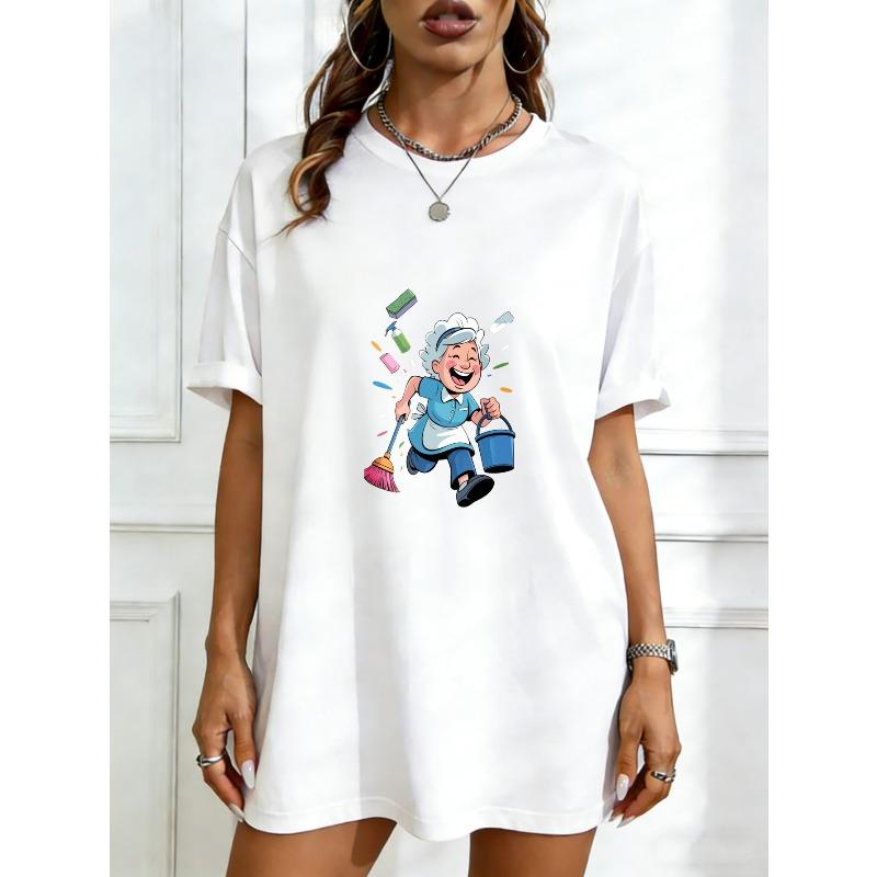 Oversized T Shirt Black Cleaning Lady Cartoon Print Casual Wear For Women Daily Outfits Street Style Fashion Top