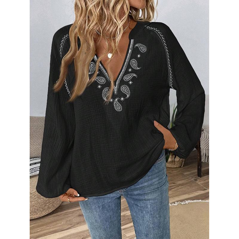 Women's Blouses Spring Fall New Style Fashion Design V-neck Embroidered Cotton Top Women Loose Casual Shirts Clothing