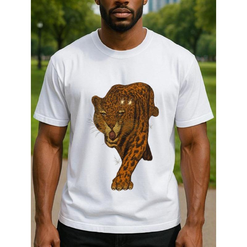 European sizes Powerful Leopard Men's Printed Short-sleeved T-shirt, Men's Simple Knitted T-shirt, Men's Casual Printed Shirt