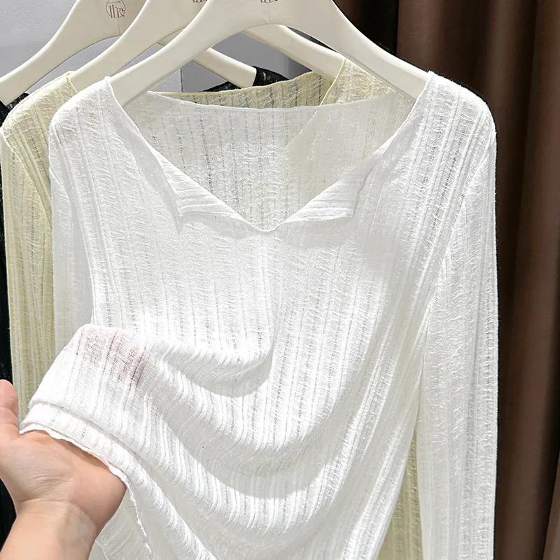 Top de punto acanalado para mujer, ajuste ceñido, manga larga, cuello en V, capa base